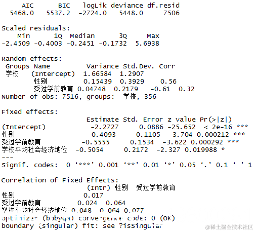 按部就班地建立一个多层次模型是很好的做法。然而,由于本文的重点不是多层次模型,我们直接从纯截距模型到我们最终感兴趣的全模型。在完整模型中,我们不仅包括性别、学前教育和学校平均社会经济地位的固定效应项和一个随机截距项,还包括性别和学前教育的随机斜率项。请注意,我们指定 family = binomial(link = "logit"),因为这个模型本质上是一个二元逻辑回归模型。