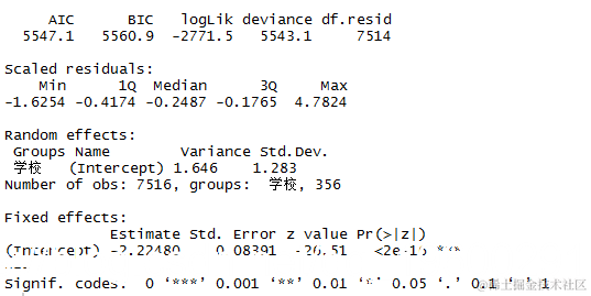为了指定一个多层次模型,我们使用lme4软件包。随机斜率项和聚类项应该用|分隔。注意,我们使用了一个额外的参数指定比默认值(10000)更大的最大迭代次数。因为一个多层次模型可能需要大量的迭代来收敛。