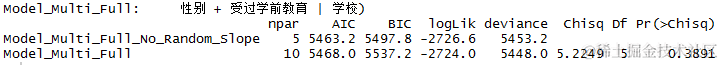 除了固定效应项之外,我们也来看看随机效应项。从之前的ICC值来看,我们知道有必要包括一个随机截距。但是,包括性别和学前教育的随机斜率的必要性就不太清楚了。为了弄清楚这一点,我们可以用似然比检验和AIC来判断随机斜率的加入是否能改善模型的拟合。