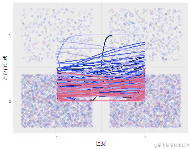 ggplot(aes(x = 性别, y = 是否留过级, color = as.factor(学校))) +