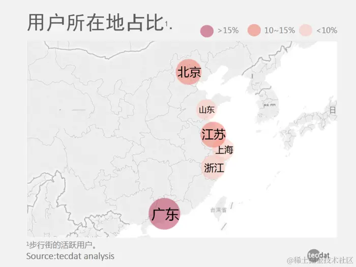 从下面的地理分布可以看出,步行街的活跃用户主要分布在经济发达的省市,如广东,江苏,北京,浙江和上海,上述五个地区占50%以上。总;