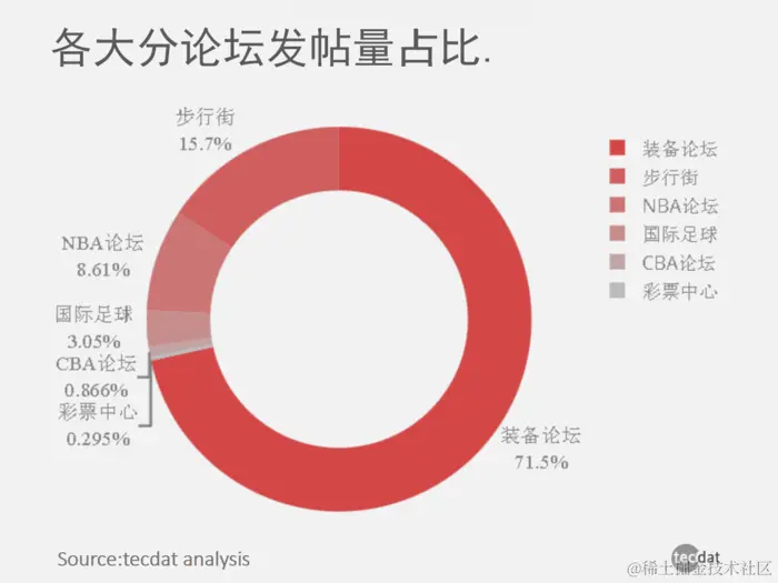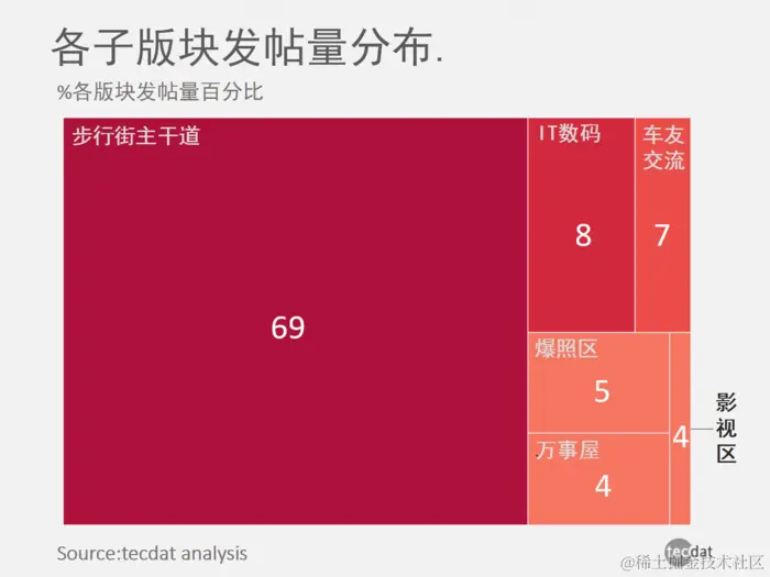 通过比较每个部分的帖子数量,您可以看到在大型子论坛中,[设备论坛]的帖子数量最多,其次是Pedestrian Street和[NBA]; 在380个小节中,[Main Street Pedestrian]和[IT Digital]最受欢迎,其次是[Cheyou exchange]和[burst]; 其中,[行人]岗位占近7成,远高于其他。