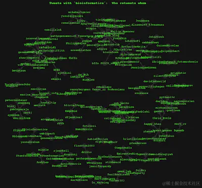 title("\nTweets with 'bioinformatics': Who retweets whom",