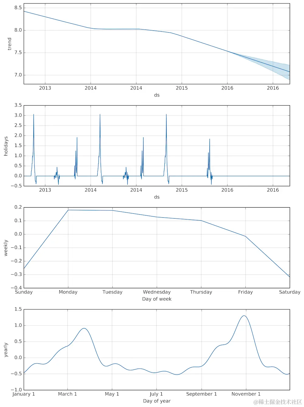 季节性变化。这是使用傅里叶级数模型化的,它只是一种近似周期函数的方法。我们可以指定我们是否预计每周或/和年度趋势存在。