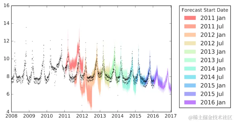 我们可以根据时间段对它们进行切片,而不是随着时间对我们的数据点进行采样。如果我们想在未来一年(即预测时间范围)测试模型的预测准确性,我们可以将数据集划分为一年(或更长)的训练集,并使用每个分部预测其下一年的数值。这种技术被称为模拟历史预测。如果我们的预测范围是一年,那么我们应该每半年进行一次模拟预测。图6显示了11个DST维基百科页面浏览量的模拟预测结果。