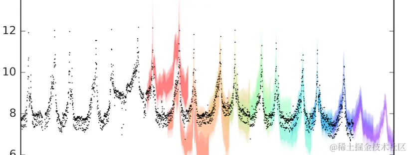 在图6中,预测范围为一年,每个训练部分包含三年的数据。例如,第一个预测频段(红色)使用2008年1月至2010年12月的数据来预测2011年1月 - 2011年12月的观点。我们可以看到,除了前两个模拟预测外,这些模拟预测被异常高的页面活动所误导在2010年,预测通常与实际值重叠。