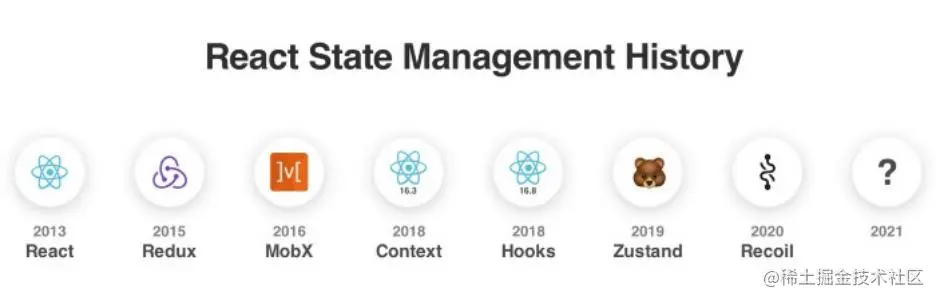 下面,我们以 " 状态管理 " 为例来说明。由于 React 缺少传统的依赖注入系统(DI 是通过组件组合实现的),所以社区不得不自己解决这个问题。然而,后来就变成了一遍又一遍地解决这个问题,每年都会带来一套新的标准。
