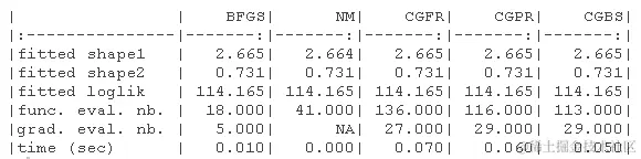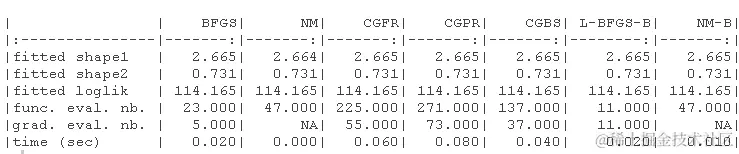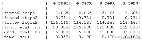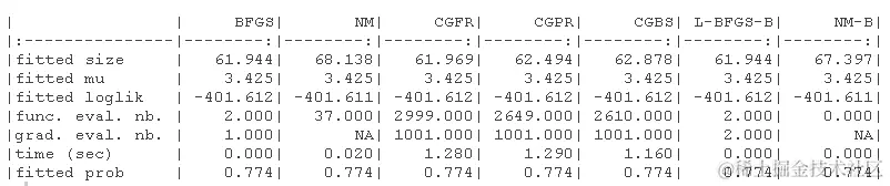 然而,不同方法的函数评价(和梯度评价)的结果是非常不同的。此外,指定对数似然性的真实梯度对拟合过程没有任何帮助,通常会减慢收敛速度。一般来说,最好的方法是标准BFGS方法或对参数进行指数变换的BFGS方法。由于指数函数是可微的,所以渐进特性仍被保留(通过Delta方法),但对于有限样本来说,这可能会产生一个小的偏差。
