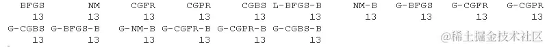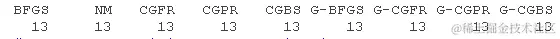 结果显示在以下表格中。1)没有指定梯度的原始参数(-B代表有界版本),(2)具有(真实)梯度的原始参数(-B代表有界版本,-G代表梯度),(3)没有指定梯度的对数转换参数,(4)具有(真实)梯度的对数转换参数(-G代表梯度)。