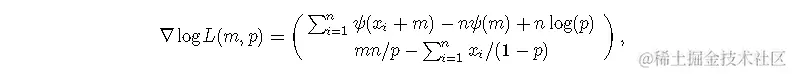 其中Γ表示β函数。存在另一种表示方法,即μ=m(1-p)/p或等价于p=m/(m+μ)。因此,一组观测值(x1,...,xn)的对数似然性是