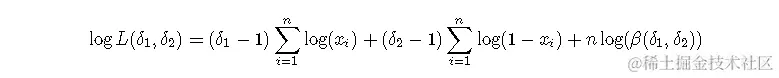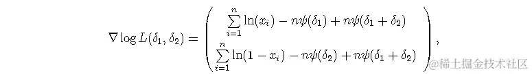 其中β表示β函数。我们记得β(a,b)=Γ(a)Γ(b)/Γ(a+b)。在这里,一组观测值(x1,...,xn)的对数似然性为
