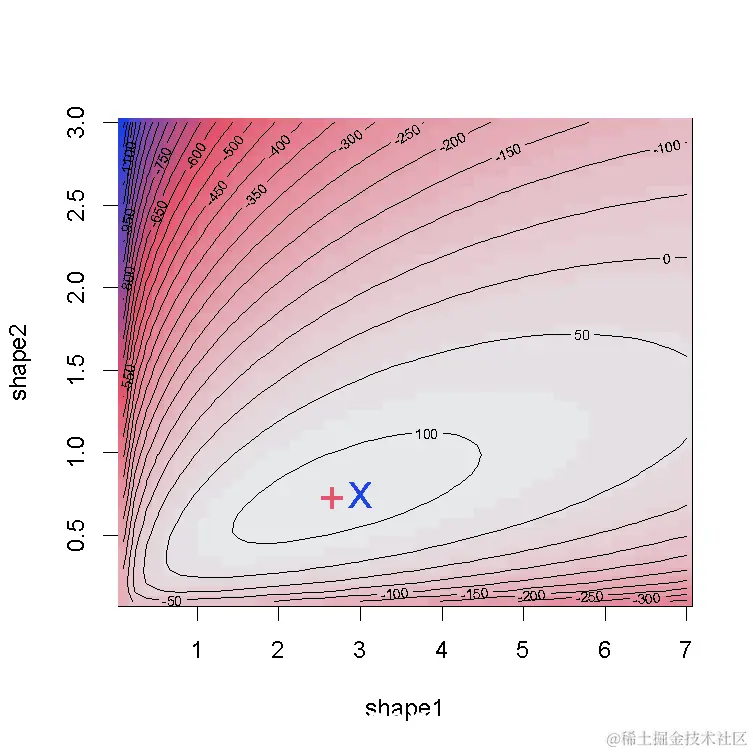 points(unconstropt[1,"BFGS"], unconstropt[2,"BFGS"], pch="+", col="red")
