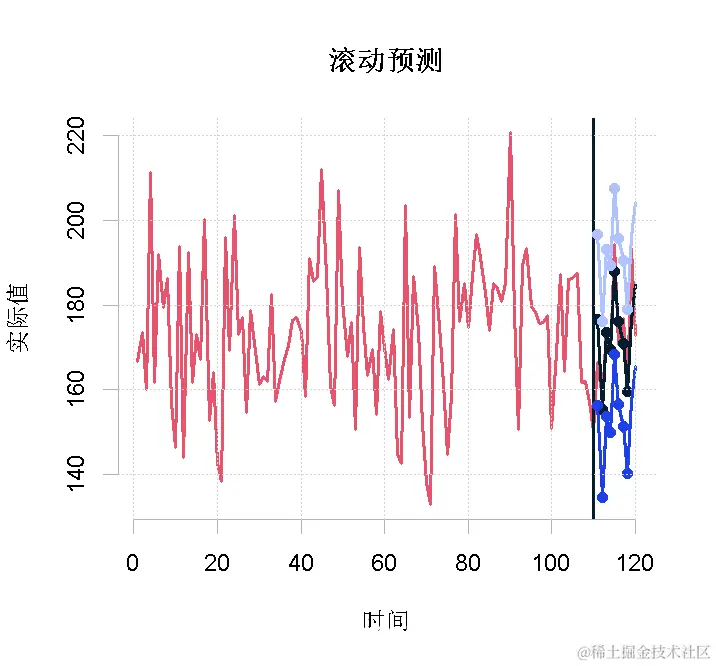 此外,函数predict.lm()返回的是一个带有数值的矩阵,而不是一个列表。 最后调用滚动预测。``