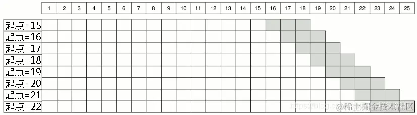 最后,在上述两种情况下,我们的样本量都在增加。然而对于某些研究目的,我们可能需要一个恒定的内样本。下图展示了这样一种情况。在这种情况下,在每次迭代中,我们在系列的末尾增加一个观察值,并从系列的开始删除一个观察值(深灰色单元)。