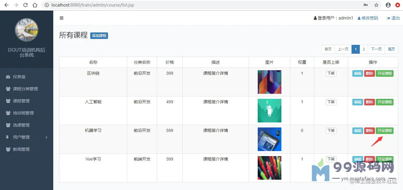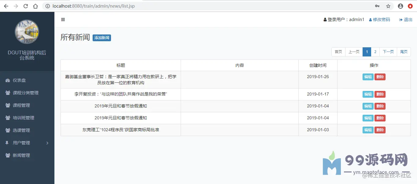管理员需要维护课程信息,即该培训机构开设的课程,以及可以教授该课程的培训师。管理员可以根据需要将其设置为不再开设。开设过培训班的课程不能删除,若某门课程从未 开设过培训班则可以删除。管理员还需维护网站新闻,包括新闻的编辑、修改、发布。系统主页显示最近发布的10条新闻。