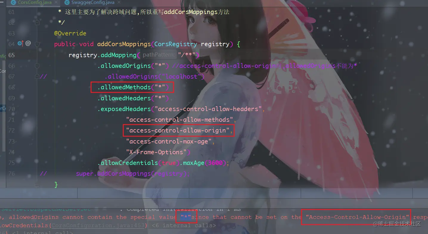 .allowedMethods("*")和Access-Control-Allow-Origin同时配置的话,控制台会报下面这样的错误: