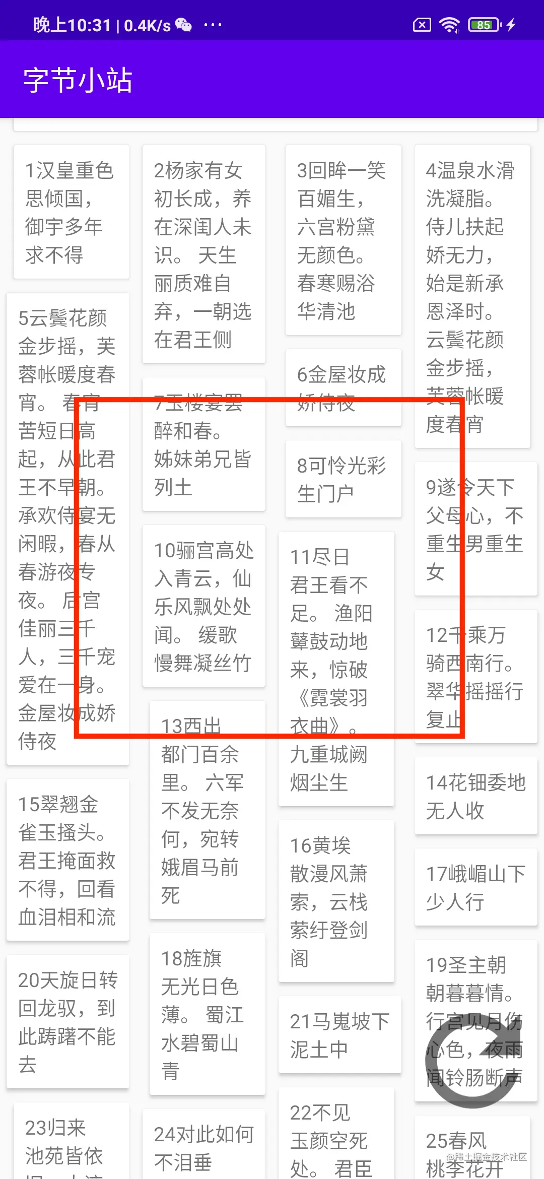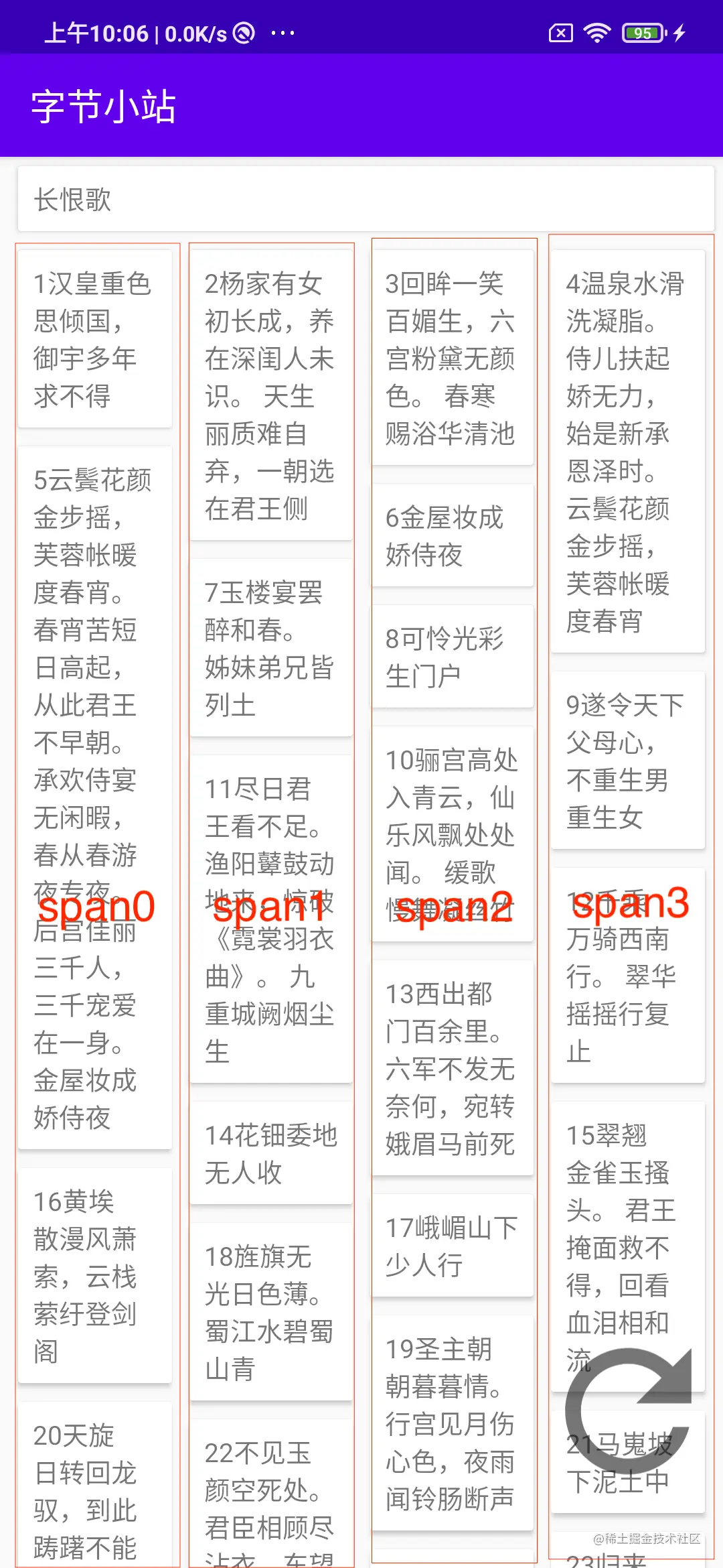 在本案例中,瀑布流共四列。屏幕被分割成四个Span。每个Span对应的下标分别是0、1、2、3。而左右间距正是根据下标变化的。如果下标不正确,那么ItemView的间距也会计算错误。比如说“1汉皇重色...”的span本来应该是0,如果变成了1,那么它的左边距和右边距就是5dp。而正确的应该是左间距10dp,右间距5dp。