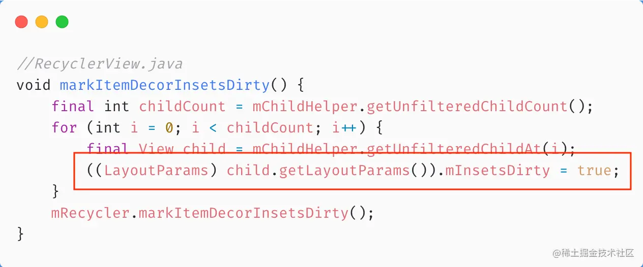 解决方法就显而易见了,在checkForGaps返回true后把lp.mInsetsDirty设成false。反射调用RecyclerView的markItemDecorInsetsDirty()