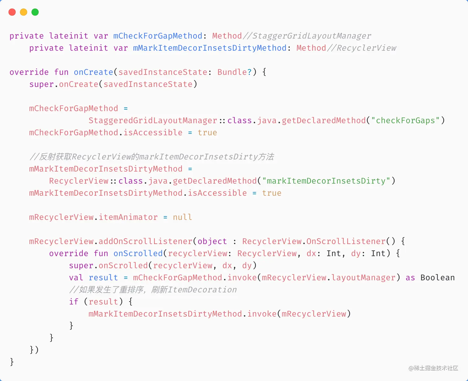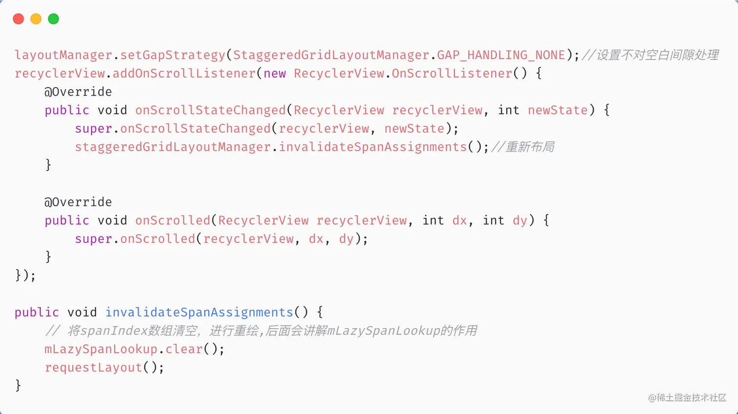我的解决方案是,通过反射StaggeredGridLayoutManager的checkForGaps()。在滑动时,仅在有需要的情况下才会重新布局。