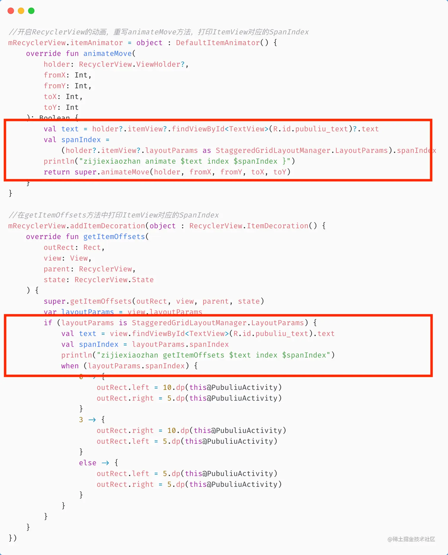 我分别在getItemOffsets()和animateMove()方法中打印spanIndex