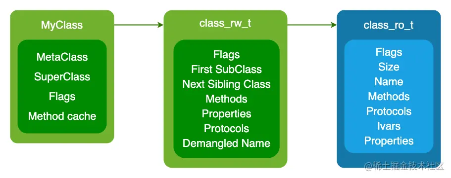 这个运行时分配的存储容量是 class_rw_t,用于读/写数据。在 class_rw_t 中,存储了只有在运行时才会生成的新信息。
