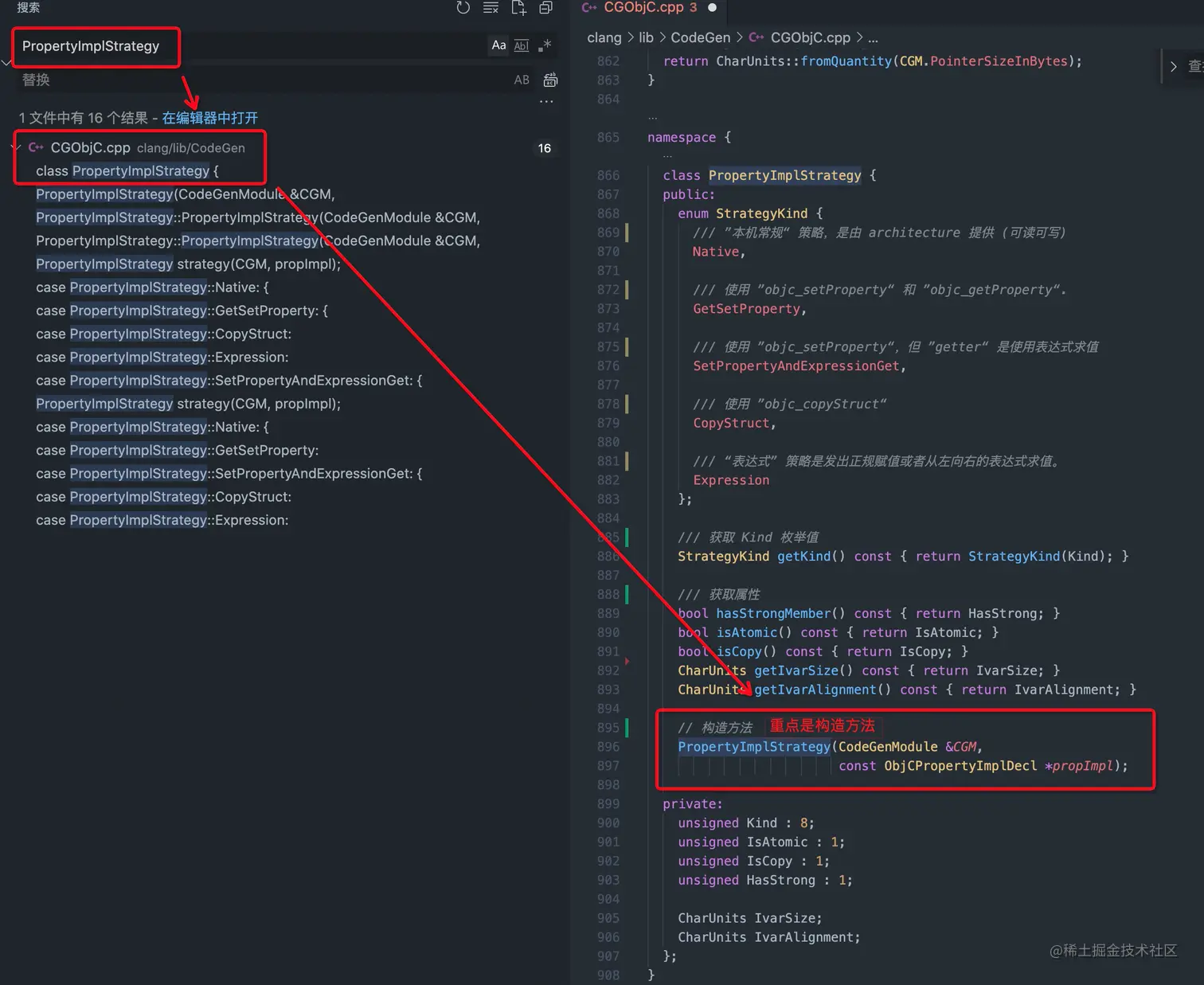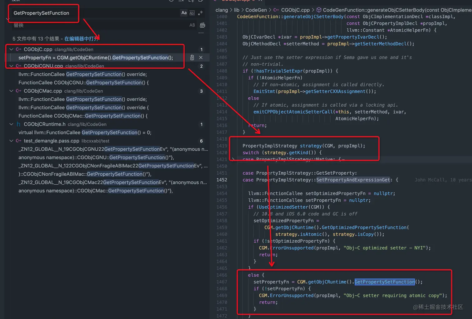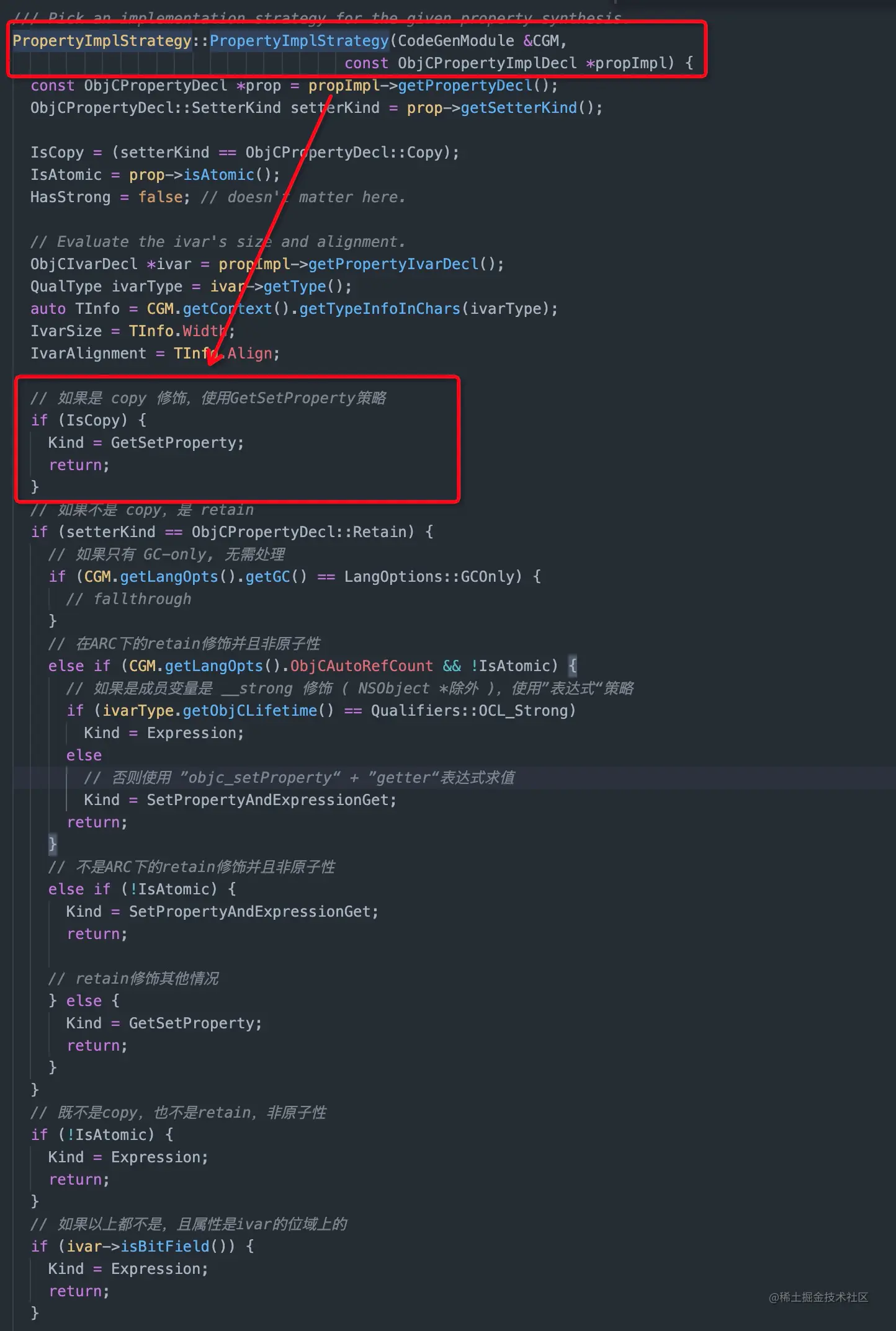 GetPropertySetFunction方法调用,是在switch选择strategy.getKind()为PropertyImplStrategy::GetSetProperty或者PropertyImplStrategy::SetPropertyAndExpressionGet时执行的。那么