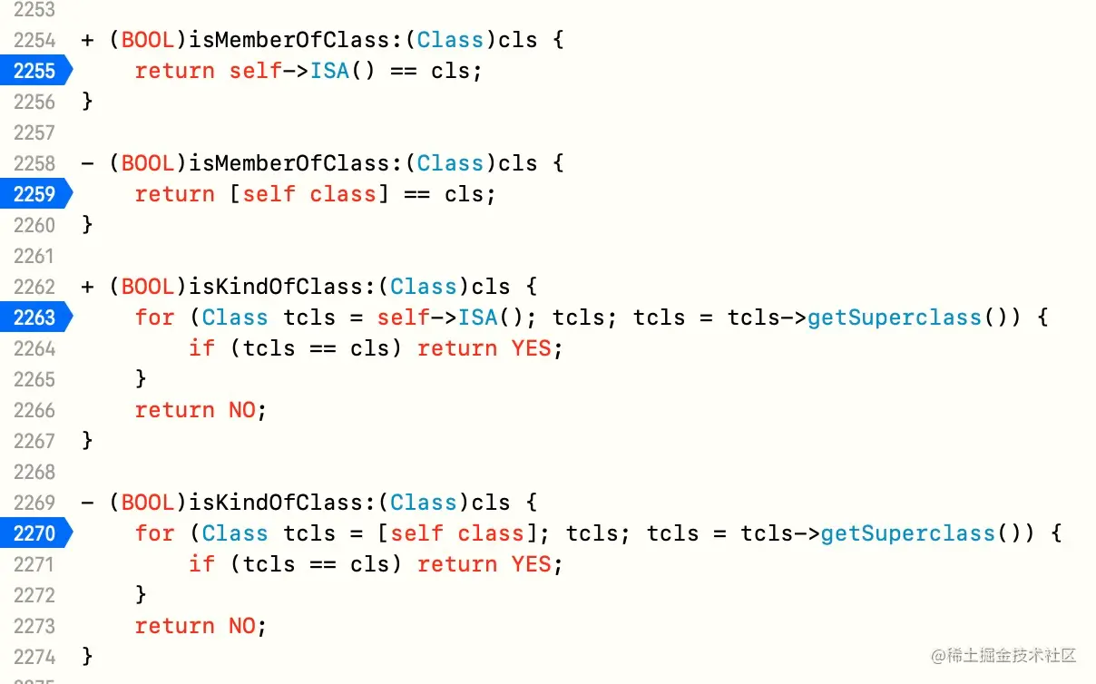 并且也在源码中找到 isMemberOfClass 和 isKindOfClass 方法,也打上断点,来具体分析其原理: