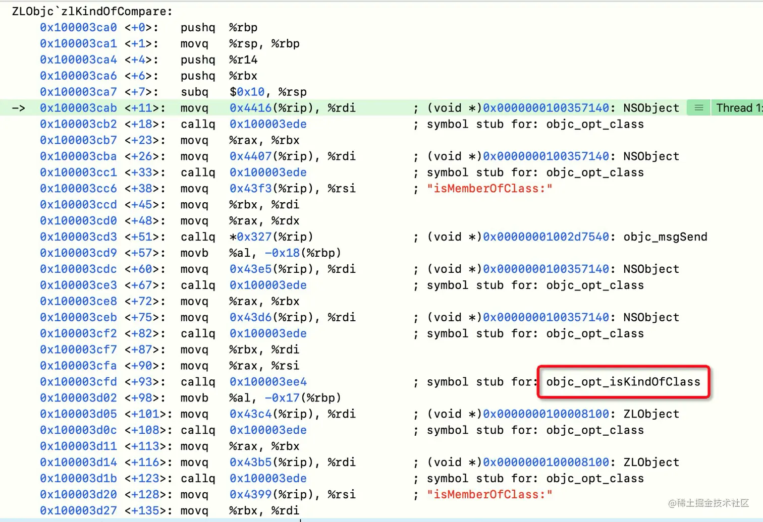 具体分析汇编才知道,isKindOfClass没有执行的原因是底层执行了 objc_opt_isKindOfClass 方法。
