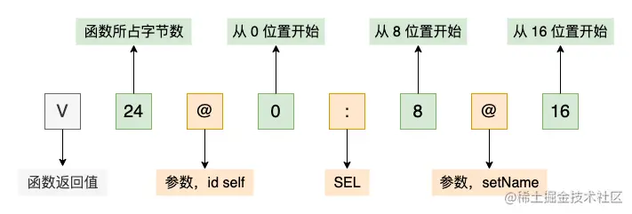 那么以上面 setName 为例,具体分析 v24@0:8@16 的实际意义。