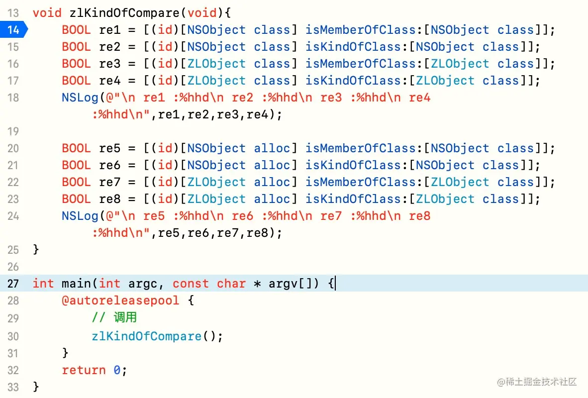 re2是NSObject的类,获取元类与NSObject不等,继续寻找获取元类的父类为NSObject与NSObject相等,返回1。re4是ZLObject的类,获取元类与ZLObject不等,继续寻找获取元类的父类为NSObject的元类依旧不等,继续往上NSObject元类的父类为NSObject依旧不等,再往上就是nil,最后返回0。re6是NSObject对象,获取类为NSObject,与NSObject相等,返回1。re8是ZLObject对象,获取类为ZLObject,与NSObject相等,返回1。