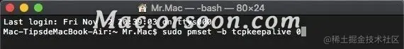 想达到绝对的省电:除了关机、手动将网络断开 / 在终端粘贴如下命令:sudo pmset -b tcpkeepalive 0 > 回车,