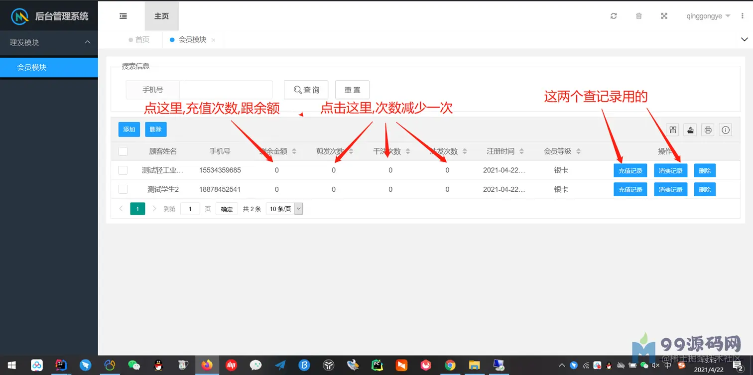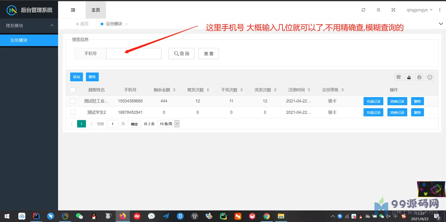 客户列表:根据手机号快速查到客户的剩余次数,剩余金额