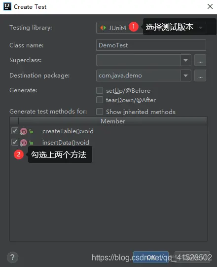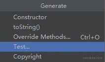 Alt+insert(右击也可找到)调出generate界面,选择Test选项