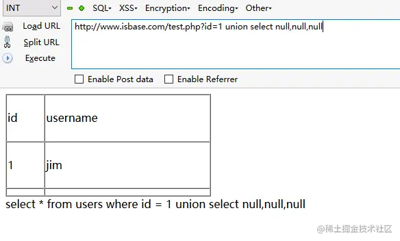 很简单,只要一次一列使用我们的测试字符串替换NULL即可,可以发现第一列和第二列都可以存放字符串,第三列数据没有输出。