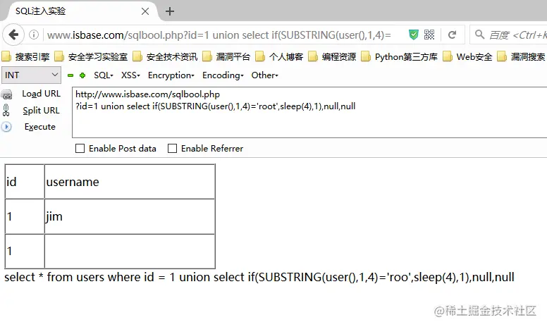 #注意使用union的条件哦,前面介绍了。同样的道理,提取用户名前四个字符做判断,正确就延迟4秒,错误返回1