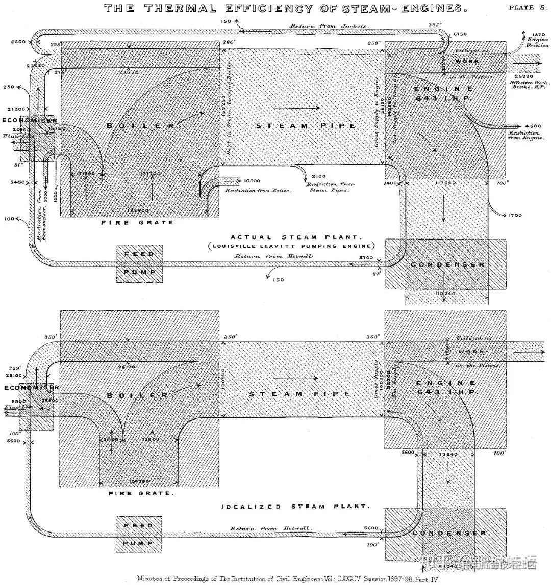 在1898年的时候,他就使用这种图形来表示蒸汽机的能源效率, 在土木工程师学会会报纪要的一篇关于蒸汽机能源效率的文章中首次推出了第一个能量流动图,此后便以其名字命名为 Sankey 图,中文音译为桑基图: