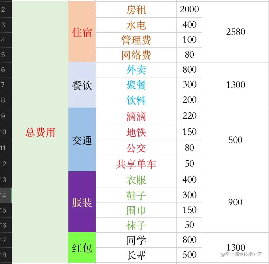 小明同学的开支主要分为5大块:住宿、餐饮、餐饮、交通、服装、红包,每个块中又分为各自的子块,以及对应的消费。