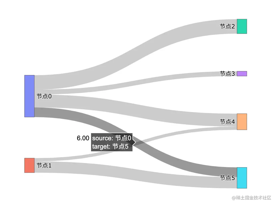 - 在桑基图的内部,不同的线条代表了不同的流量分布情况,节点不同的宽度代表了特定状态下的流量大小