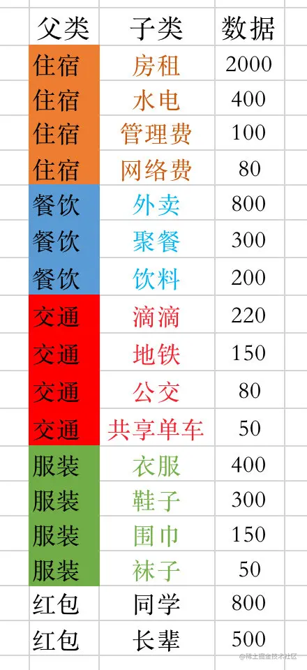 1、首先我们看看小明同学整理的消费数据(虚拟数据)