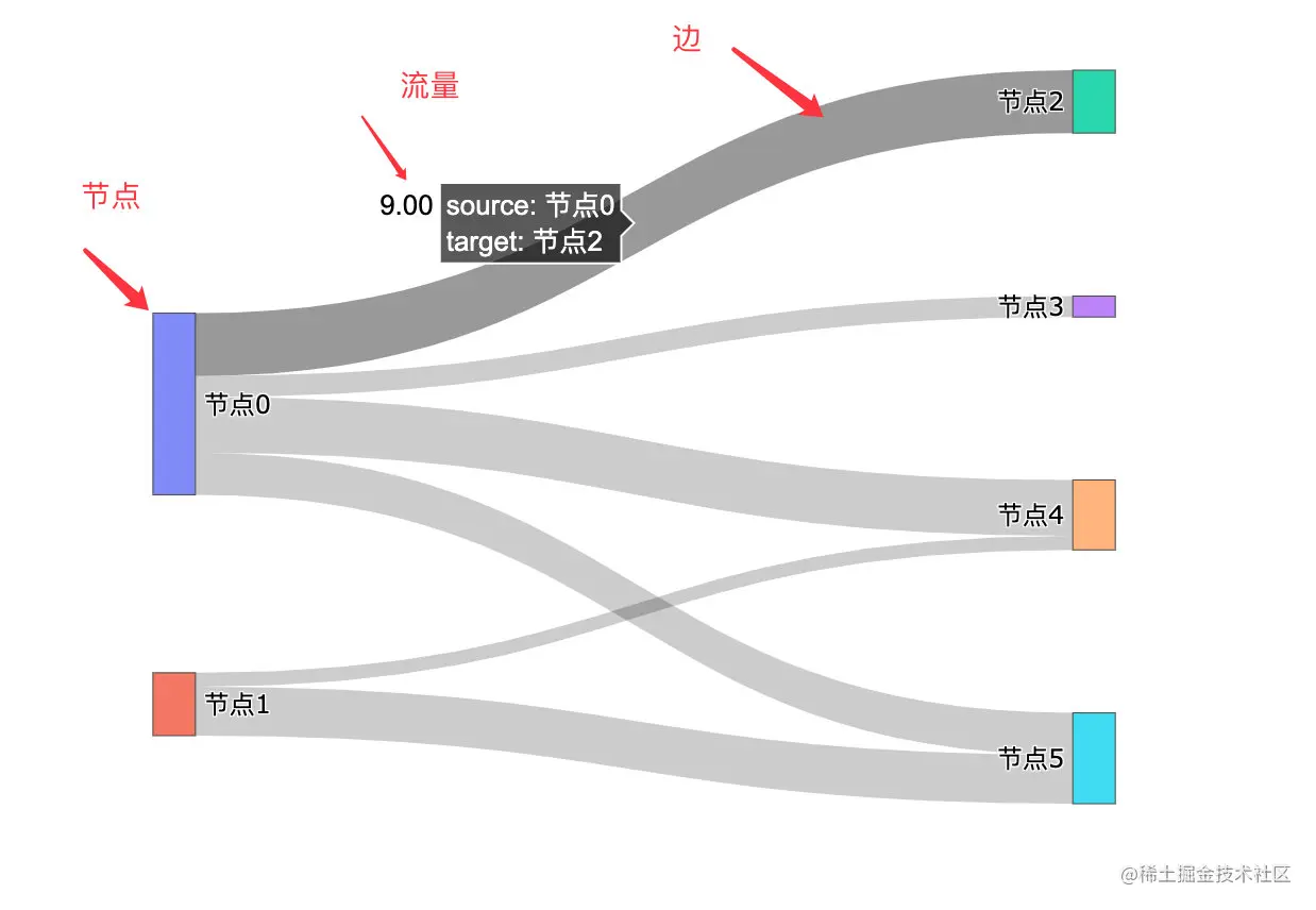 桑基图构成的3要素:节点、流量、边
