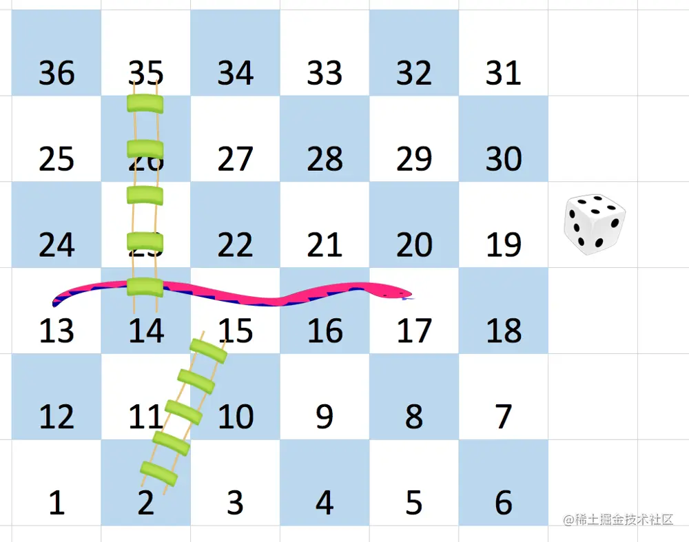 - 传送玩家:如果目标方格 S 处存在蛇或梯子,那么玩家会传送到蛇或梯子的目的地。否则,玩家传送到目标方格 S。 注意,玩家在每回合的前进过程中最多只能爬过蛇或梯子一次:就算目的地是另一条蛇或梯子的起点,你也不会继续移动。