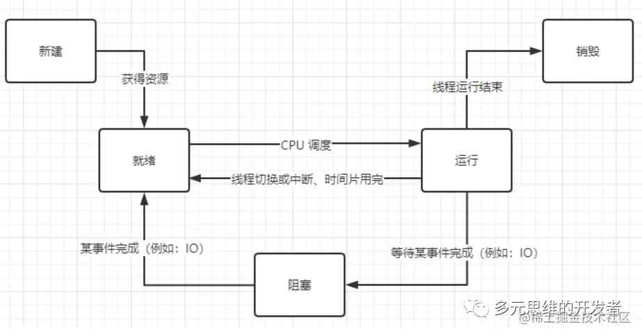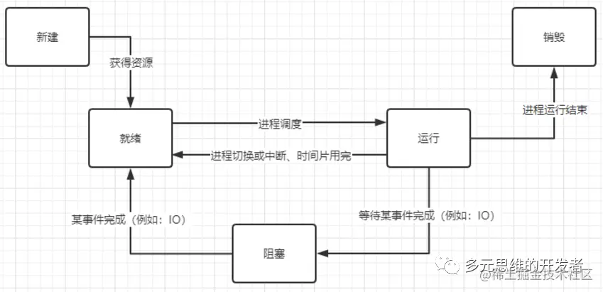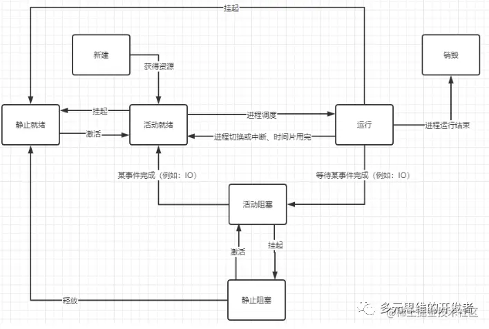 (进程管理)02.进程和线程的状态切换 多元思维的开发者 2021-06-27 1,022 阅读1分钟 进程的状态切换: 进程主要有五种状态,分别是新建、就绪、运行、阻塞、销毁。如下图: 严格来说,进程还有挂起的状态,主要为了解决内存资源不足的问题。如果终端用户请求、父进程请求、负荷调节都需要使用挂起状态。如下图: 在就绪和阻塞两个状态中,再区分静止就绪和活动就绪,以及静止阻塞和活动阻塞;静止与活动状态之间通过激活和挂起来相互切换,同时运行状态可以通过挂起来切换成静止就绪状态。 线程的状态切换: 线程是进程的微观表现,因此线程的状态基本与进程状态一致,切换的条件也是基本一致。如下图: