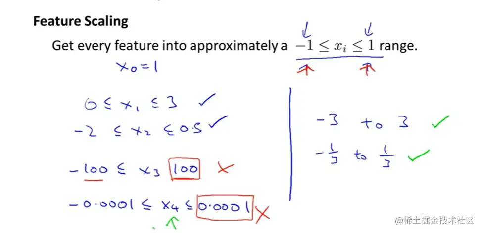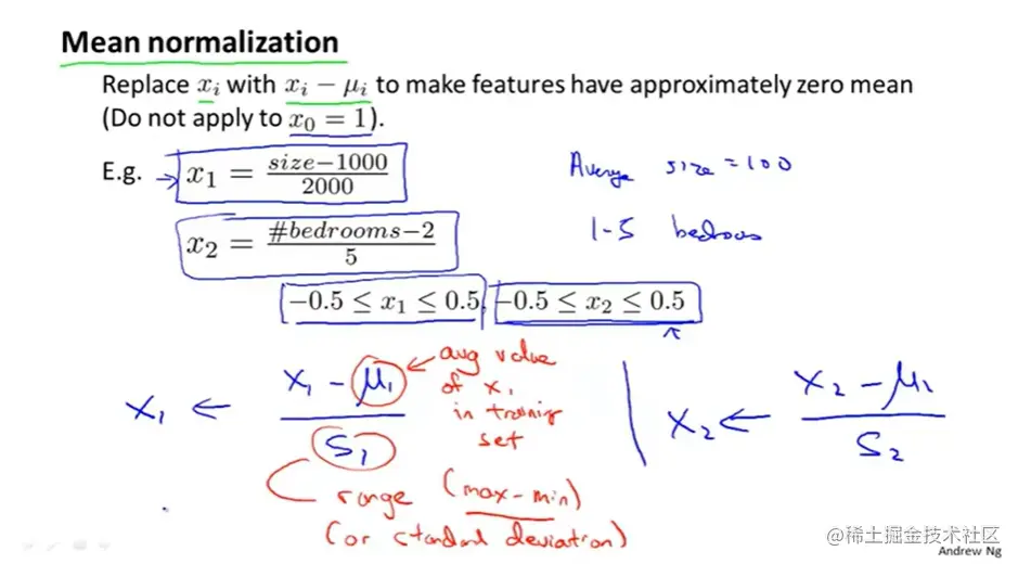 有多个变量来求全局最优解的时候,如果变量的取值范围非常不一样,会使得等高线图变得扁平,比如图中的房屋尺寸和房间数量,一个是0-2000另外一个是1-5,会导致求全局最优解变得很慢,要花很长时间来计算。