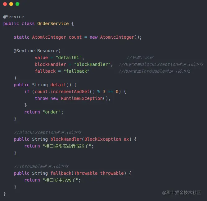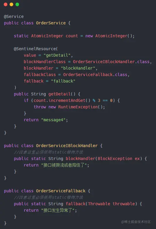 | fallback | 用于在抛出异常时候提供 fallback 处理逻辑。fallback 函数可以针对所有类型的异常(除了exceptionsToIgnore 中排除的异常),函数要求: 1. 返回类型与原方法一致 2. 参数类型需和原方法匹配 3. 默认需和原方法在同一个类中。若希望使用其他类的函数,可配置 fallbackClass,并指定对应的方法 |