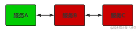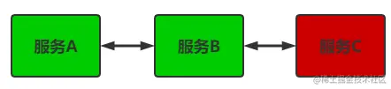好景不长,主人火了,并发量上来了。可能因为服务C还不够健壮的原因,服务C在某一天宕机了,但是服务B还是依赖服务C,不停的进行服务调用