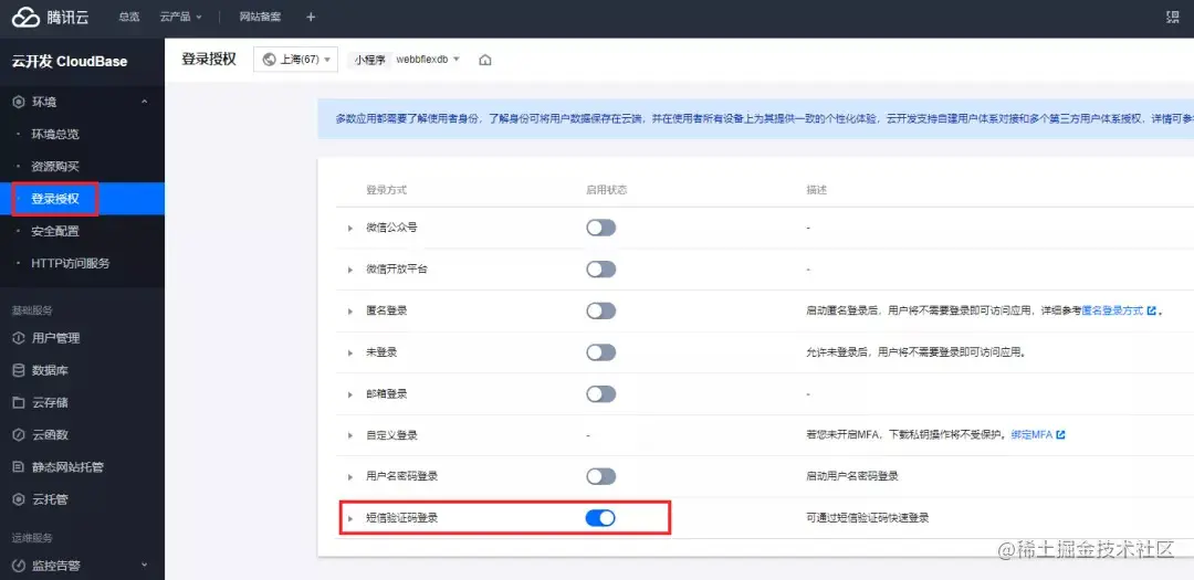 1、前往云开发控制台,在 环境-登录授权 中,开启相应的登录授权开关,如“短信验证码登录”。
