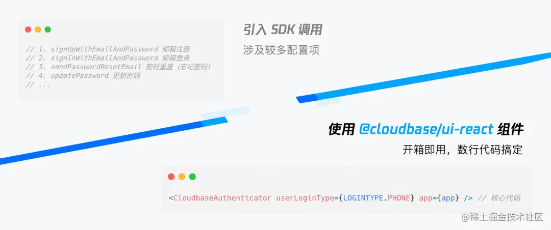 对比之前需要开发者引入 SDK 并使用相关 API 才能实现登录鉴权,现在只需几行核心代码,直接引入组件进行开发即可!