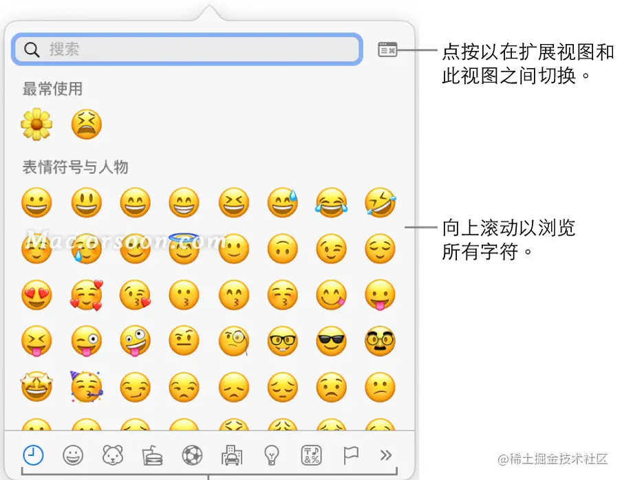 1.在您想要放置字符的文本中点按,然后选取“编辑”>“表情与符号”(或按下 Control-Command-空格键)。“字符检视器”出现在您点按的位置。如果想要在工作时保持打开“字符检视器”,您可以将它拖到桌面。