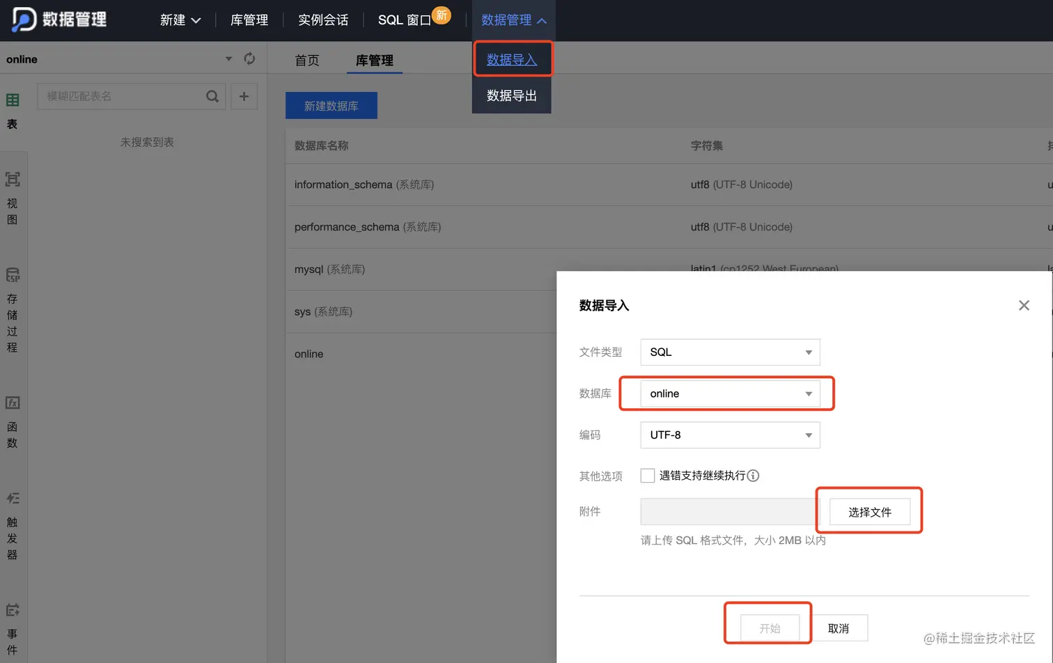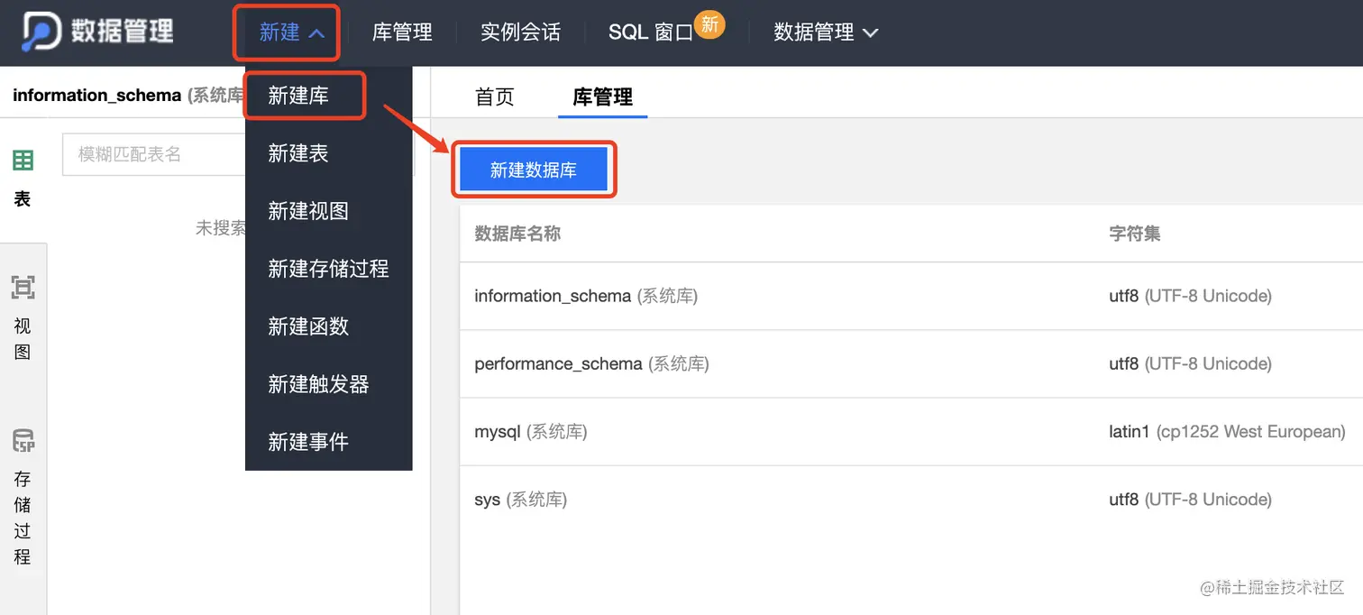 (9) 点击右上角「数据库管理」按钮,进入数据库管理后台,开始创建一个库,如下图所示,这里库名叫 online (名称随意,若更改的话注意之后操作相应改变)