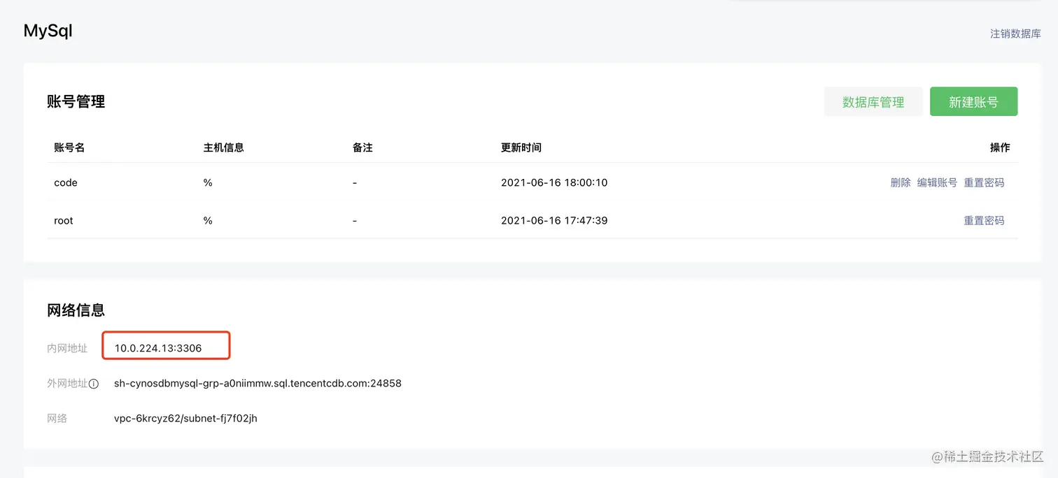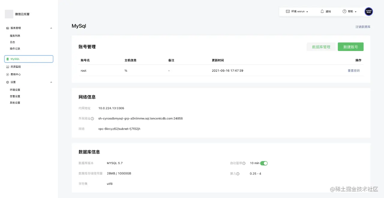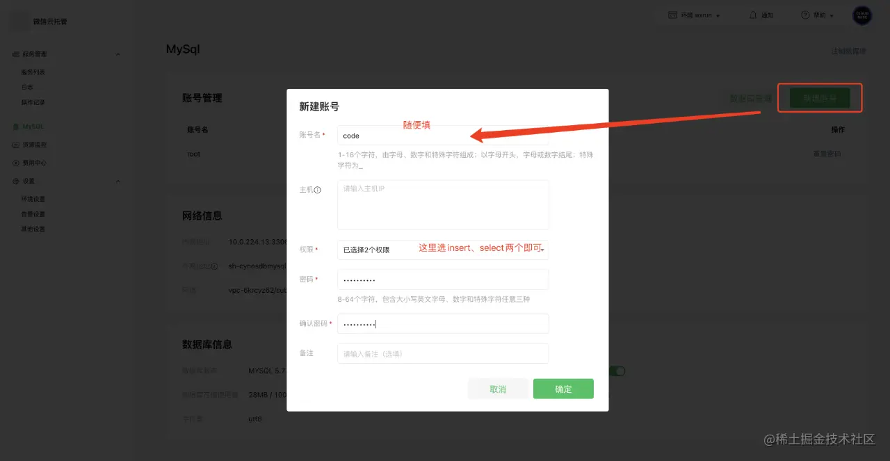 (11) 返回微信云托管控制台,mysql栏中添加一个账户,专门用于编程调用,如下图所示: